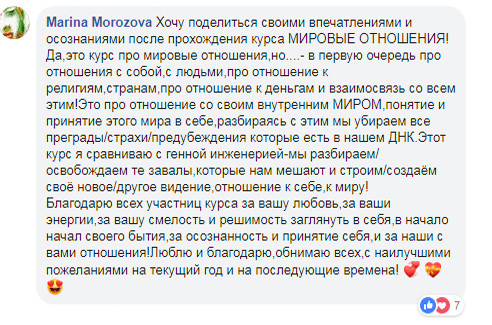 Курс «Мировые отношения» поднимает и позволяет убрать глубокую генетическую ненависть к другим народам, очиститься от ненависти к своему и другим народам, культурам, религиям, людям. На этом курсе вы поднимете и трансформируете тысячи убеждений со всех четырех уровней, очищая не только себя, но и весь свой род от этих воспоминаний. Вы познаете новую форму любви и понимания людей всей планеты.